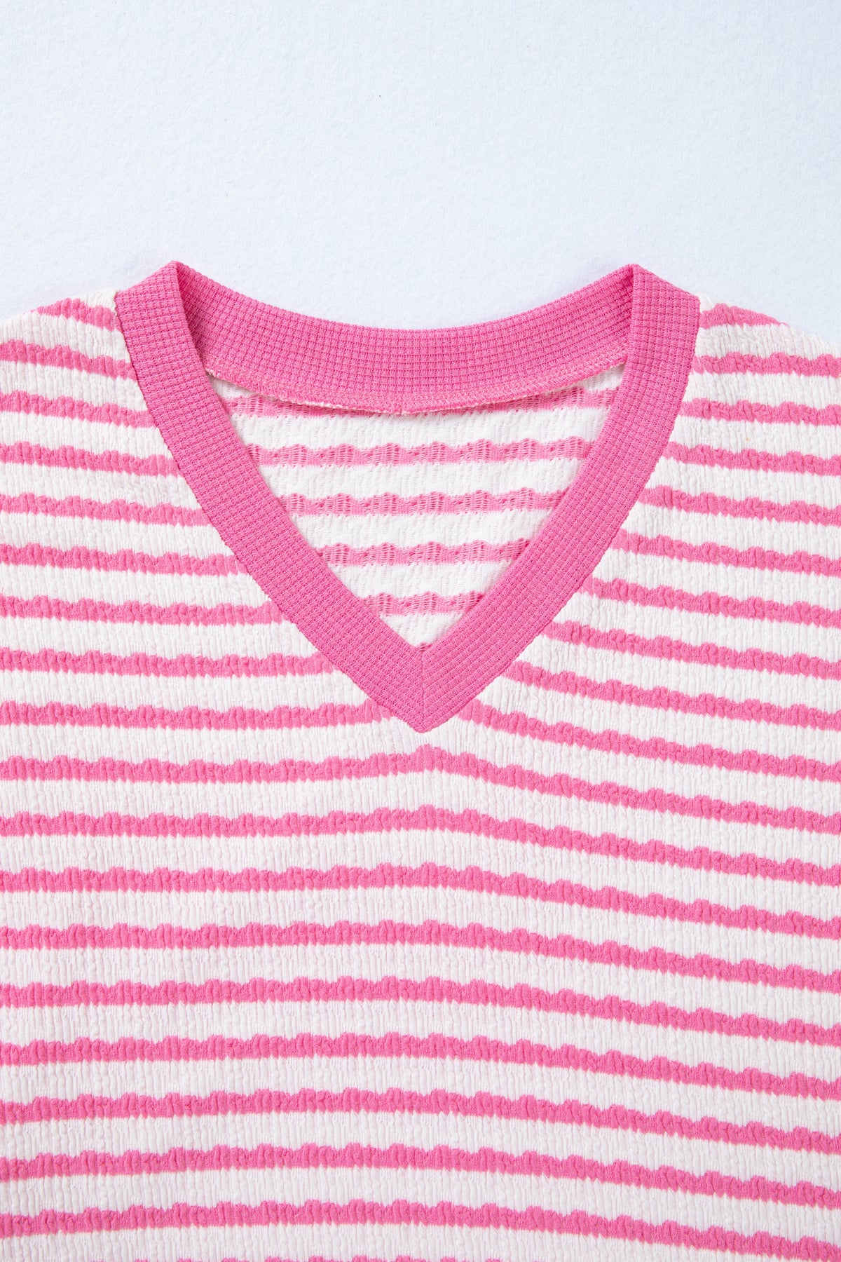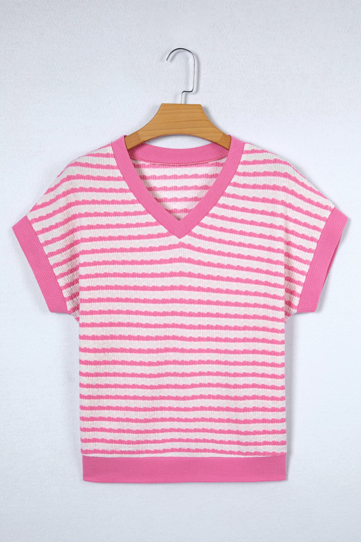 Let Georgia Trim Short Sleeve Top do the work for you on days you want instant style with zero fuss. Soft textured knit top offers breathable comfort for everyday wear. Flattering V neck short sleeve top pairs easily with jeans or shorts. Lightweight textured knit fabric provides a chic, elevated casual look. A versatile V neck design that transitions effortlessly from work to weekend. Material: 85%Polyester+10%Viscose+5%Elastane.