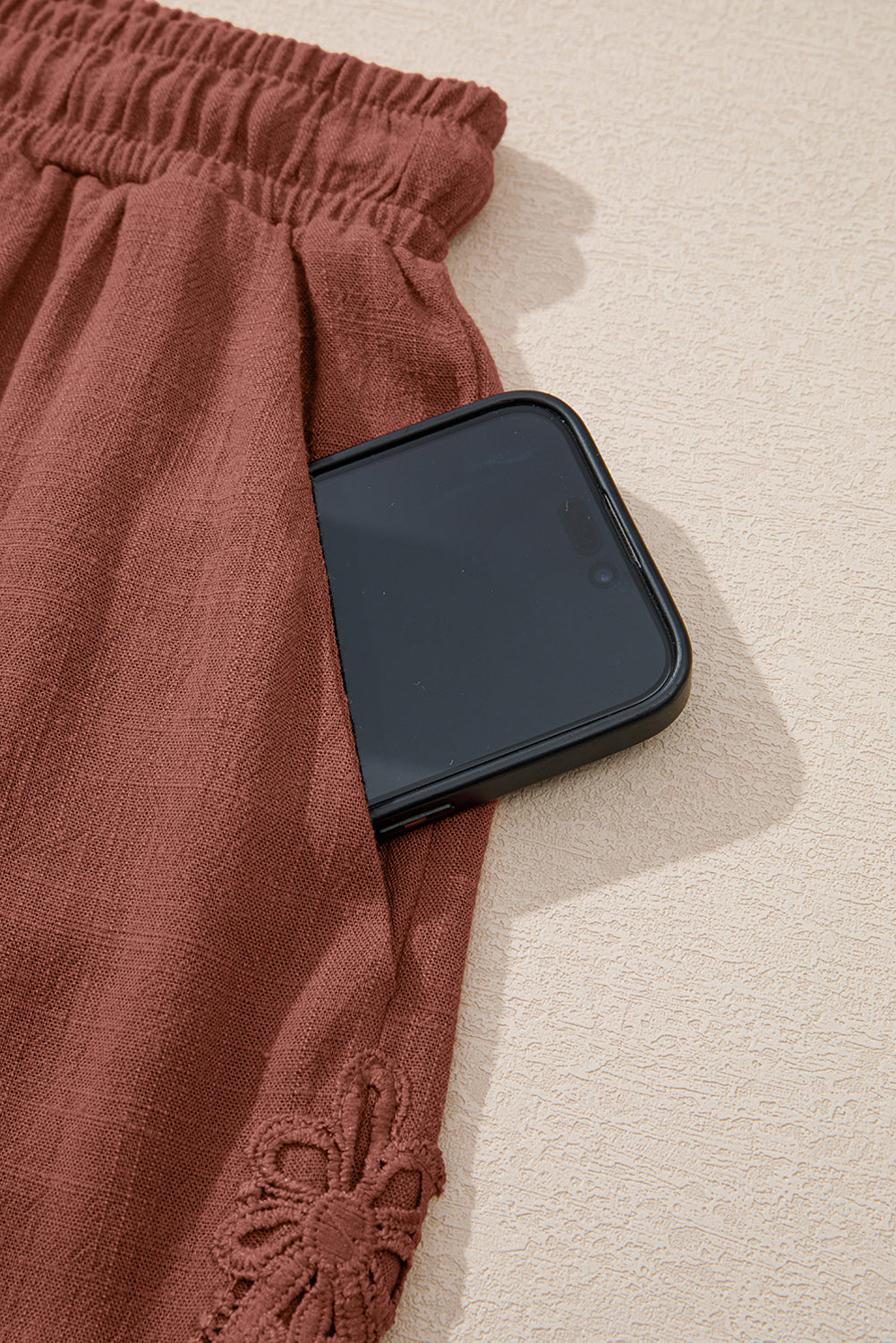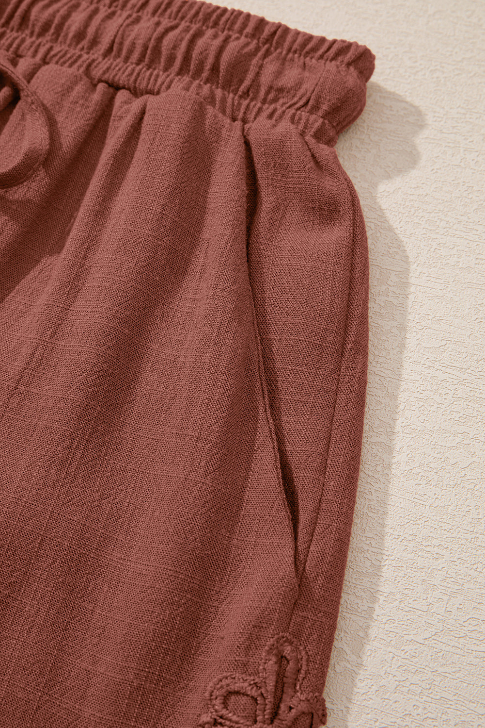 Kaia Waist Loose Linen Shorts is made for real life—easy to wear, easy to love. These casual linen shorts are summer favorites. Solid color fabric with delicate lace splicing. Casual loose fit with a drawstring elastic waist. Different colors and sizes are available to choose from. Material: 80%Viscose+20%Linen.