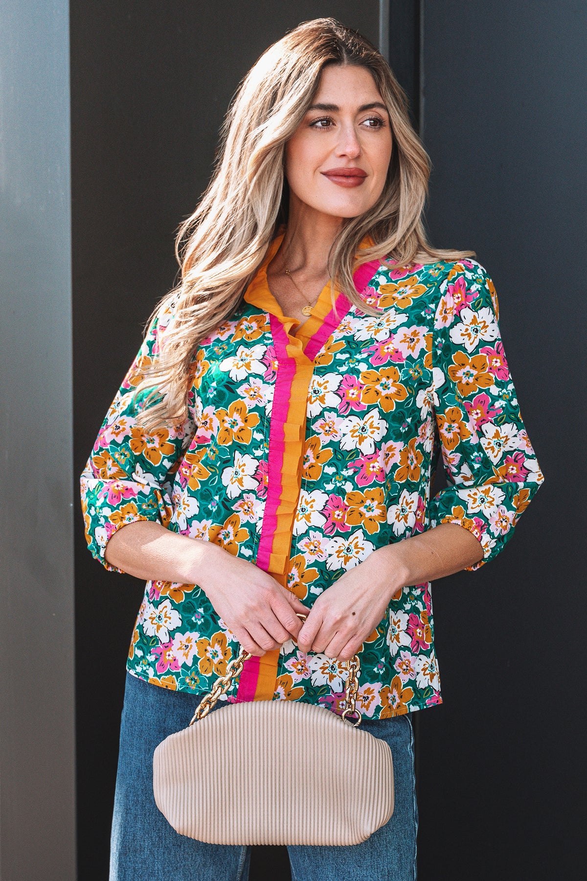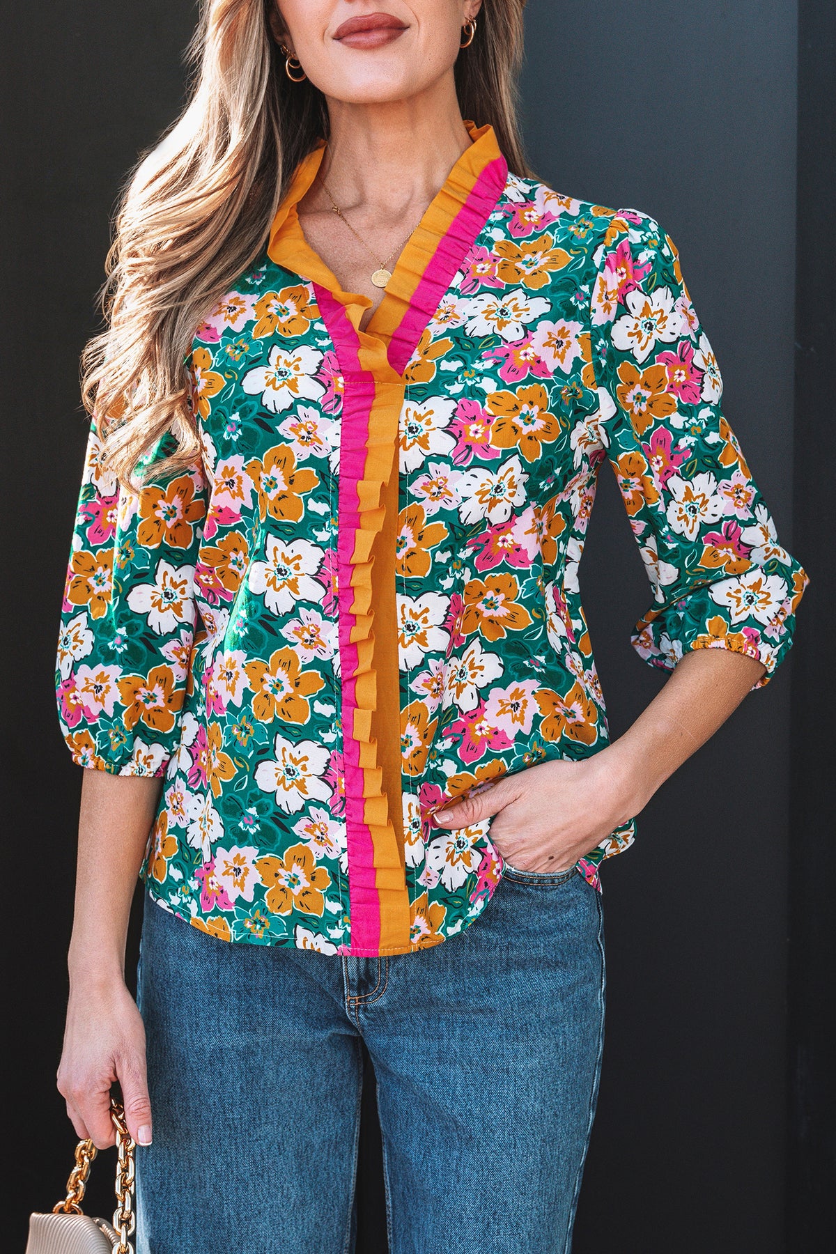 Slip into Meadow 3 4 Sleeve Blouse—soft, easy, and perfect for busy days on the go. Elegant floral print blouse with chic contrast frilled trim details. V neck design enhances the neckline for a graceful, feminine look. 3/4 sleeves offer breathable comfort for any season. Lightweight fabric keeps you stylish and comfy all day long. Material: 55%Cotton+45%Viscose.