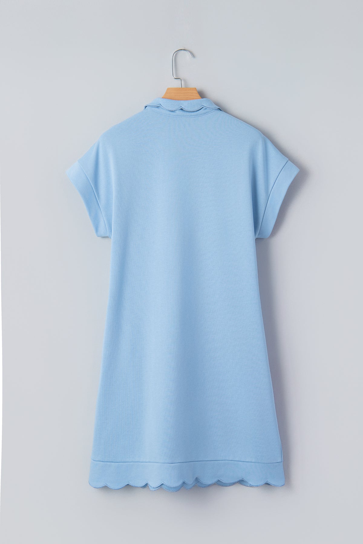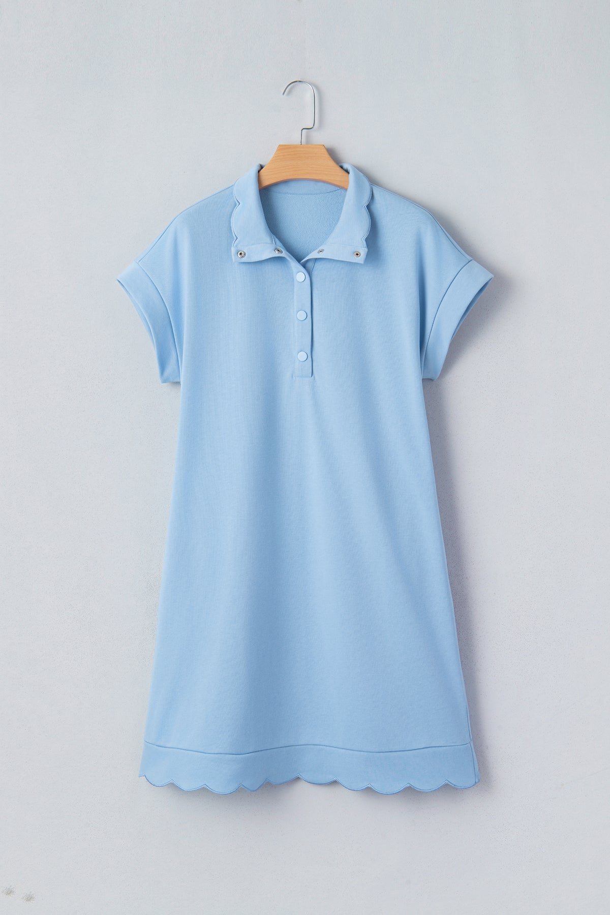 Meet Blake Scallop Hem Mini Dress—a flattering, easy-to-wear piece you'll reach for again and again. Chic polo mini dress with snap buttons for a sporty, modern look. Short sleeve dress keeps you cool and stylish for daily outings. Scallop hem adds a feminine touch to this simple solid color dress. Soft, stretchy fabric makes this pullover dress comfy all day long. Material: 80%Polyester+20%Cotton.