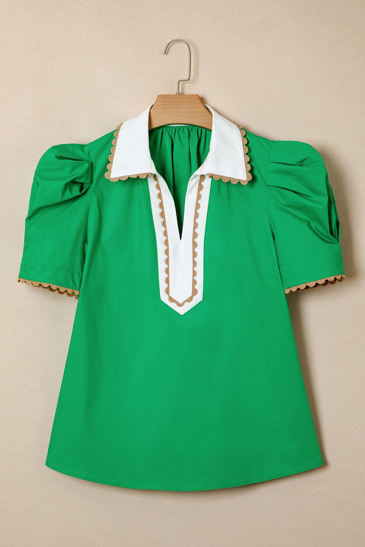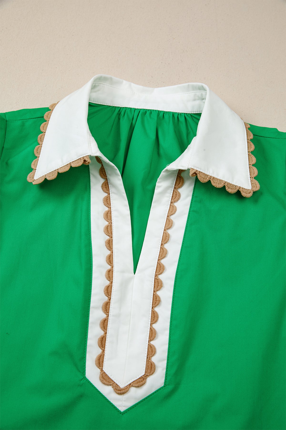 Eileen Collar Short Sleeve Blouse is the piece you'll reach for when you want to look put together in seconds. The ricrac trim adds this short sleeve top a delicate touch. Bold patchwork creates a fresh, modern look with eye-catching contrast. Shirt collar brings a clean, polished edge suitable for work or casual styling. Lightweight fabric keeps it breathable and comfortable for warm days. Material: 100%Cotton.