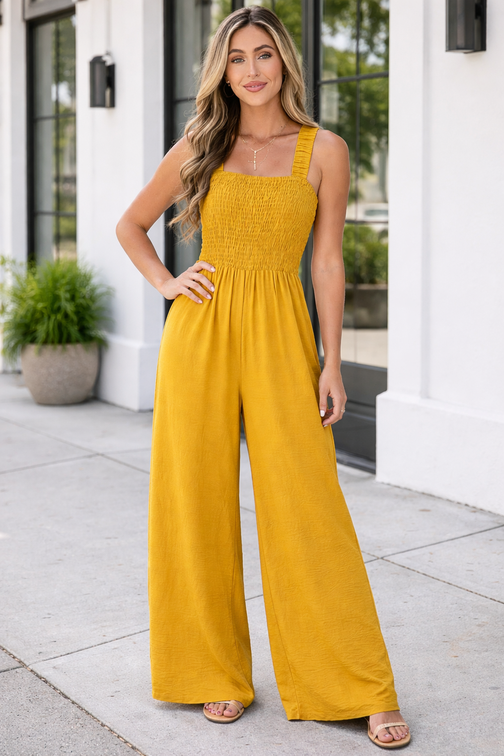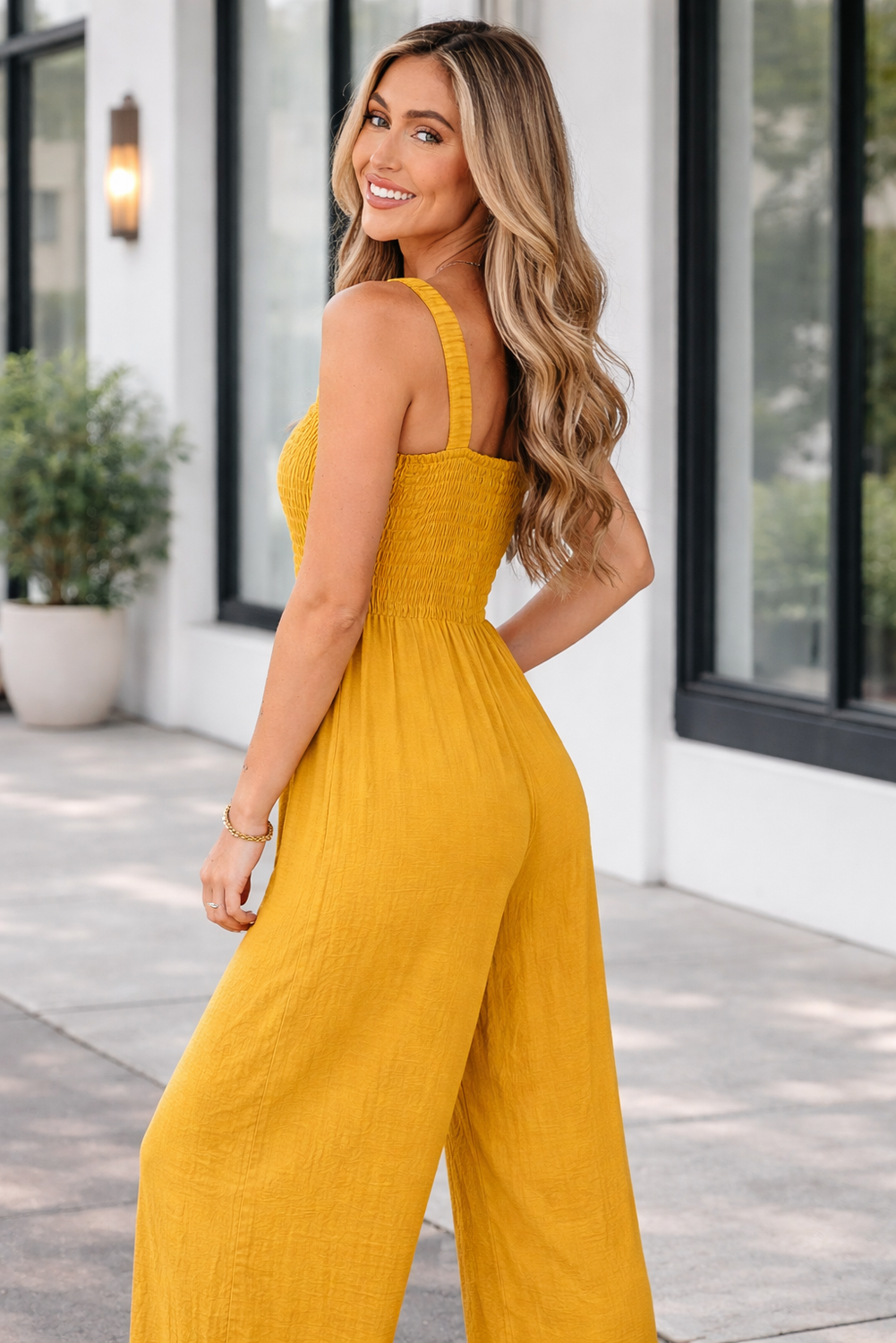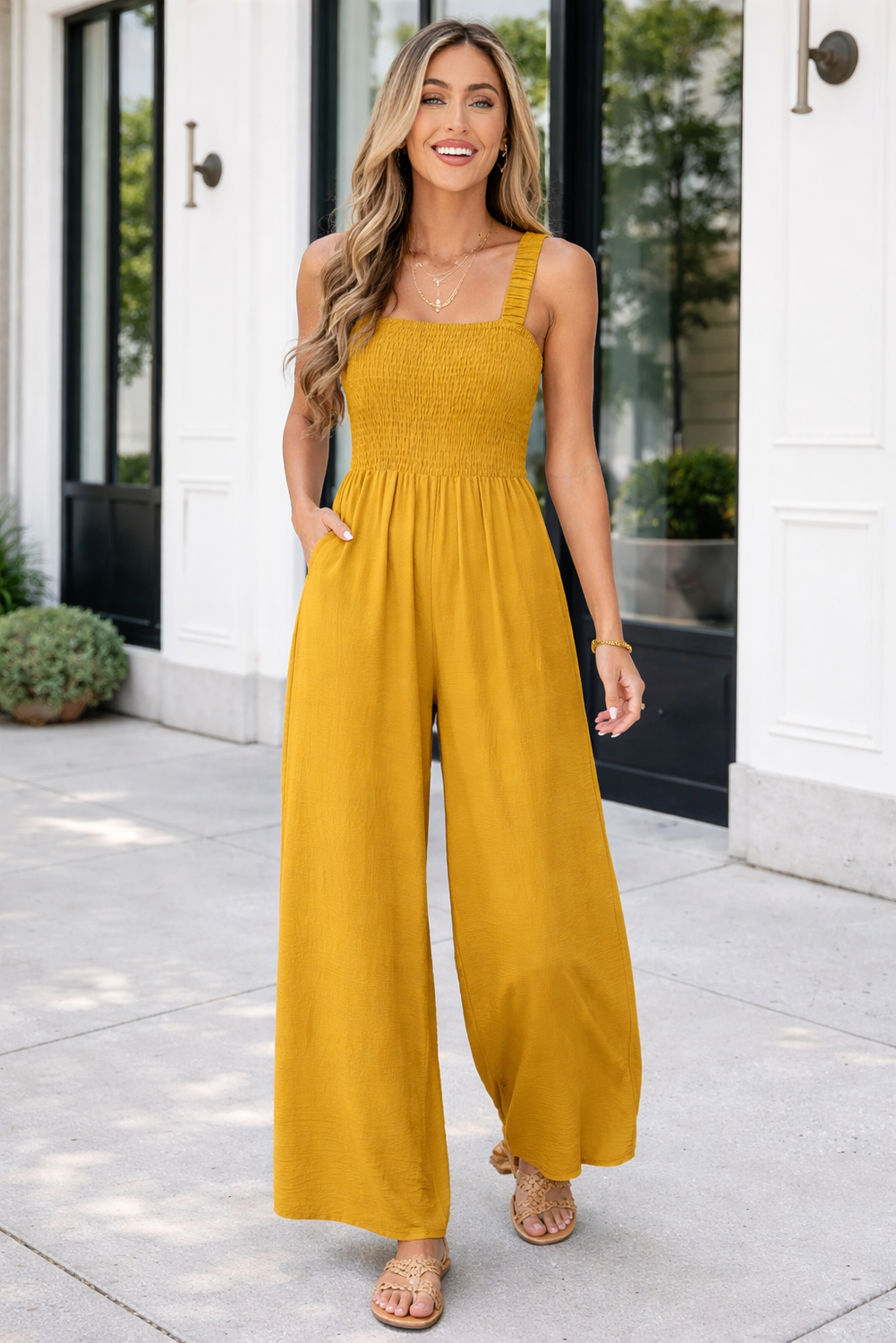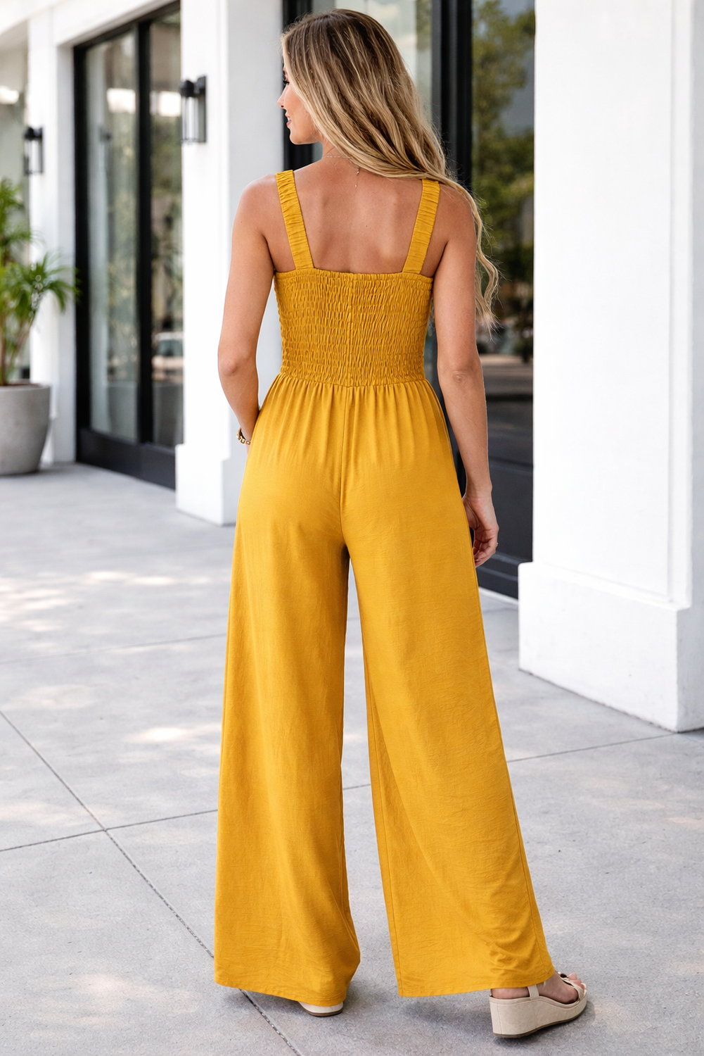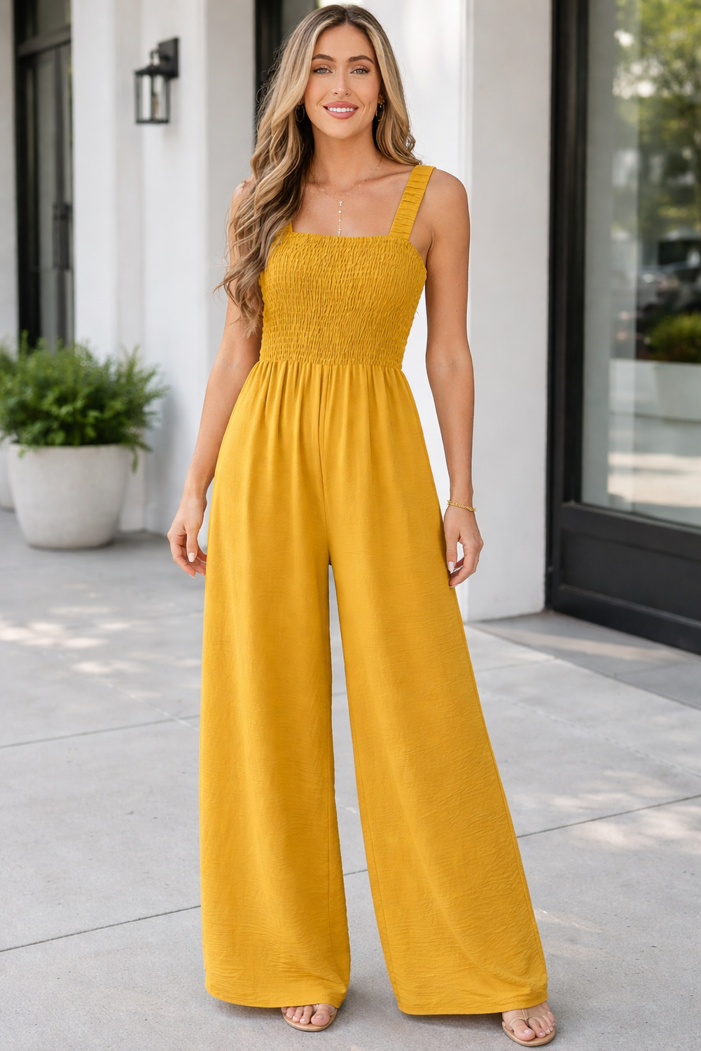 Let Rebecca Sleeveless Wide Leg Jumpsuit do the work for you on days you want instant style with zero fuss. This shirred jumpsuit fits most body shapes with elasticity Featured with a square neckline, sleeveless, ruched waist, wide leg, and side pocket Made of soft, lightweight, comfortable, and breathable fabric Styling with flats, sandals, sneakers, and high heels jumpsuits are suitable for casual or formal occasions Material: 100%Polyester.
