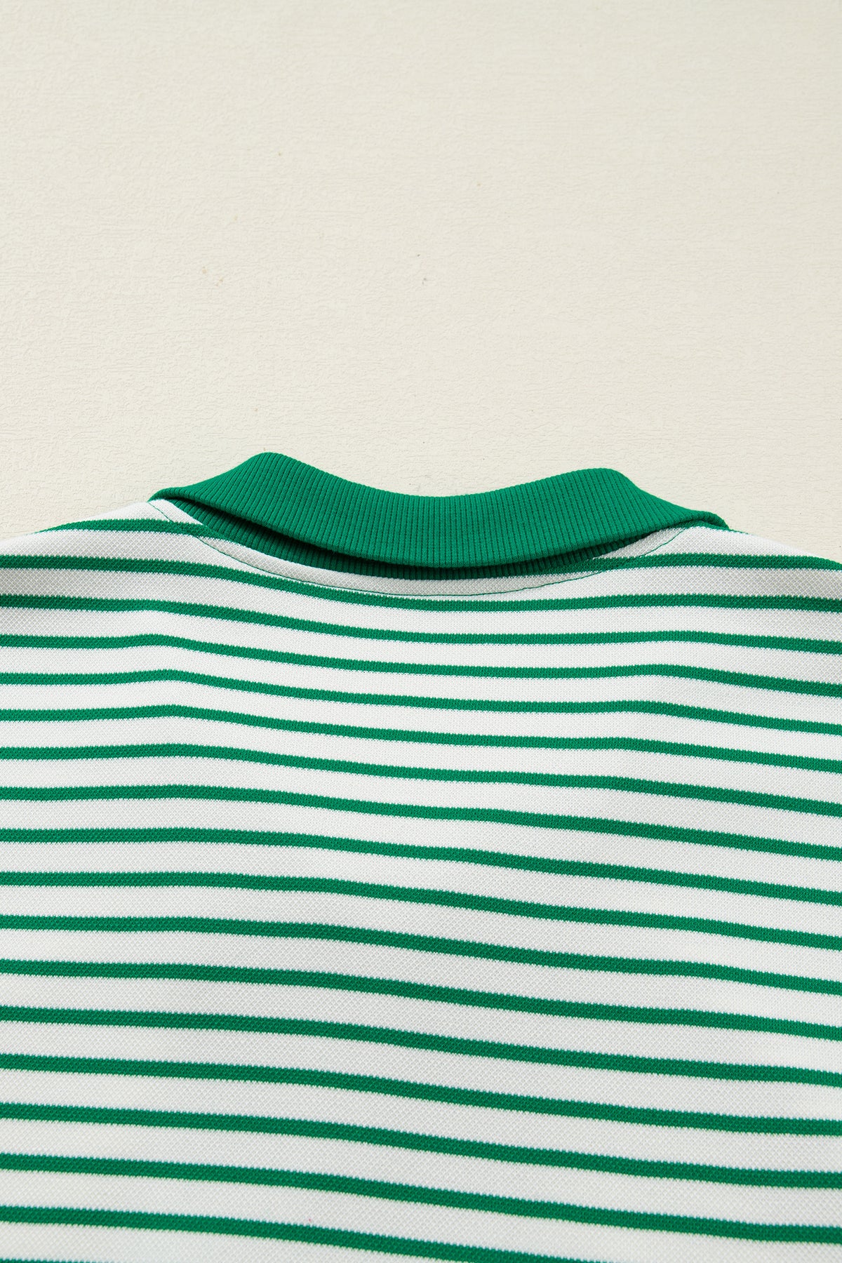 Stay comfy and put-together all at once in Royalty Polo Collar T Shirt. This t-shirt dress is classic with a striped print silhouette. The quarter zip design is convenient while the polo collar design is casual chic. Short sleeve dress is flattering for most with a shift fit style. This knit mini dress designed with side pockets is versatile. Material: 70%Polyester+30%Cotton.