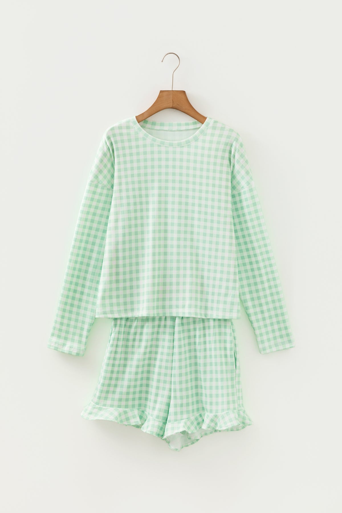 Say hello to Sutton 2pcs Lounge Set Long Sleeve Top—effortless, everyday style with comfort built in. Gingham lounge set adds a cute, classic touch to relaxed days. Long sleeve loose top offers cozy comfort for lounging or casual wear. Drawstring shorts provide an adjustable, easygoing fit. Soft fabric makes this matching lounge set perfect for all-day comfort. Material: 95%Polyester+5%Elastane.